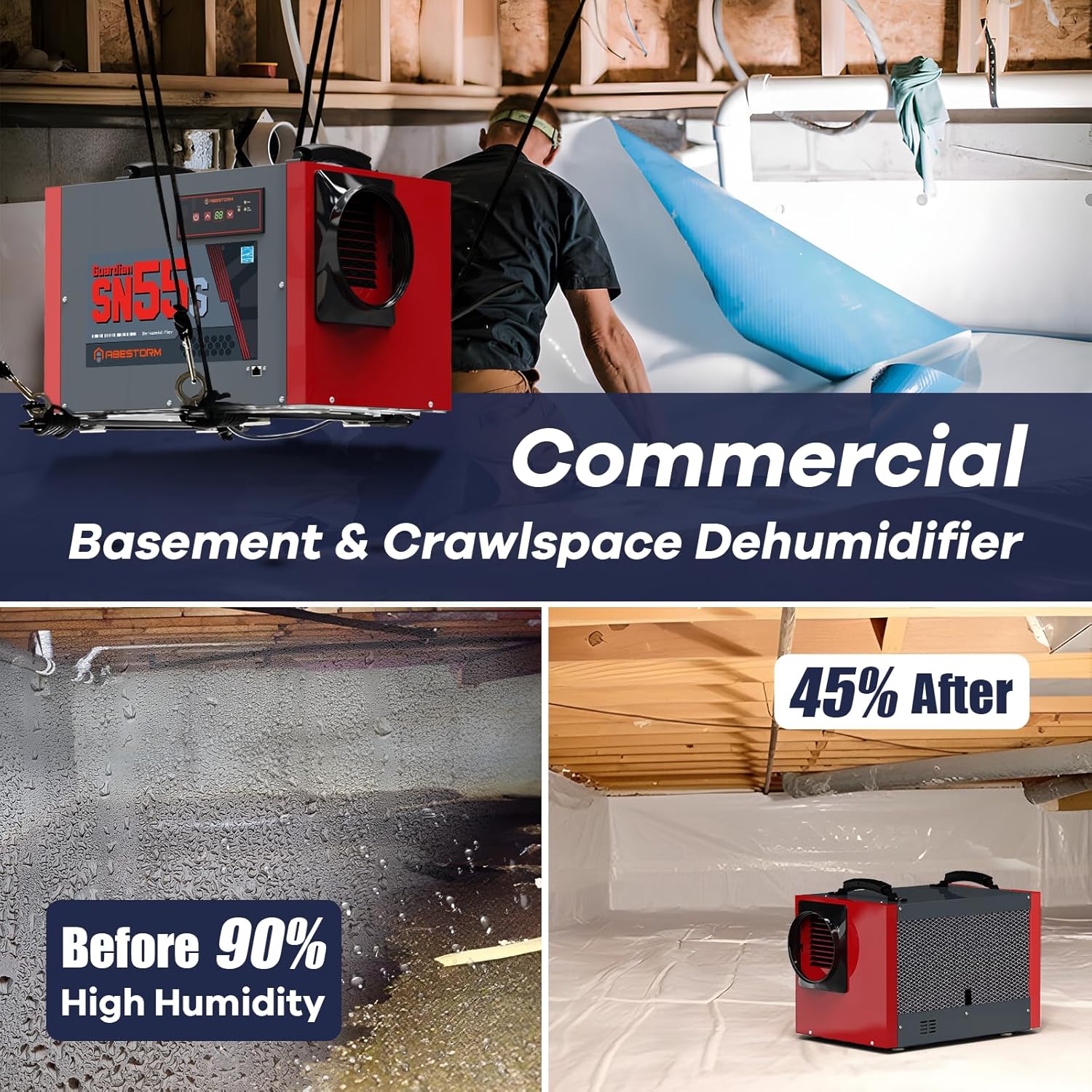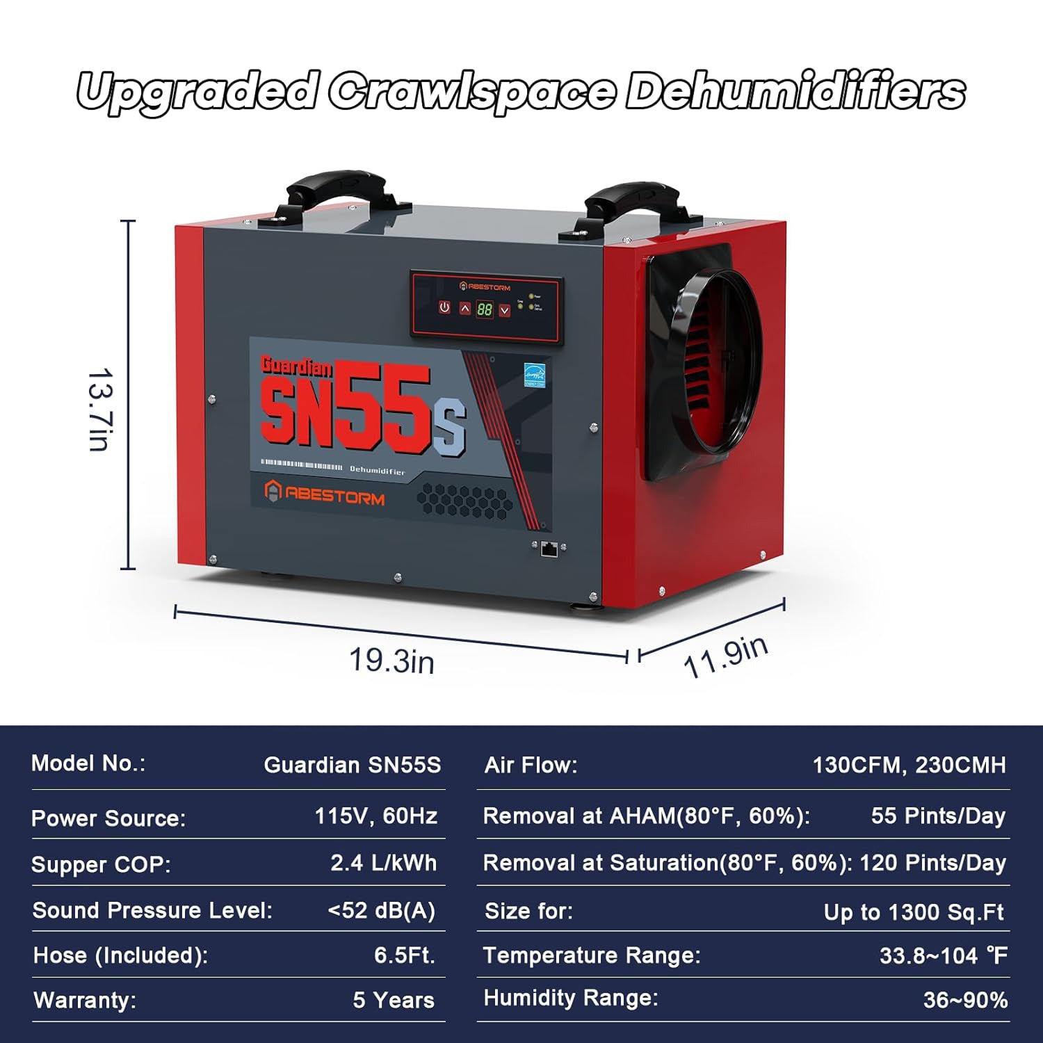 High Capacity: ABESTORM SN55 dehumidifier removes up to 120 pints of moisture per day at saturation, making it ideal for large, damp areas.