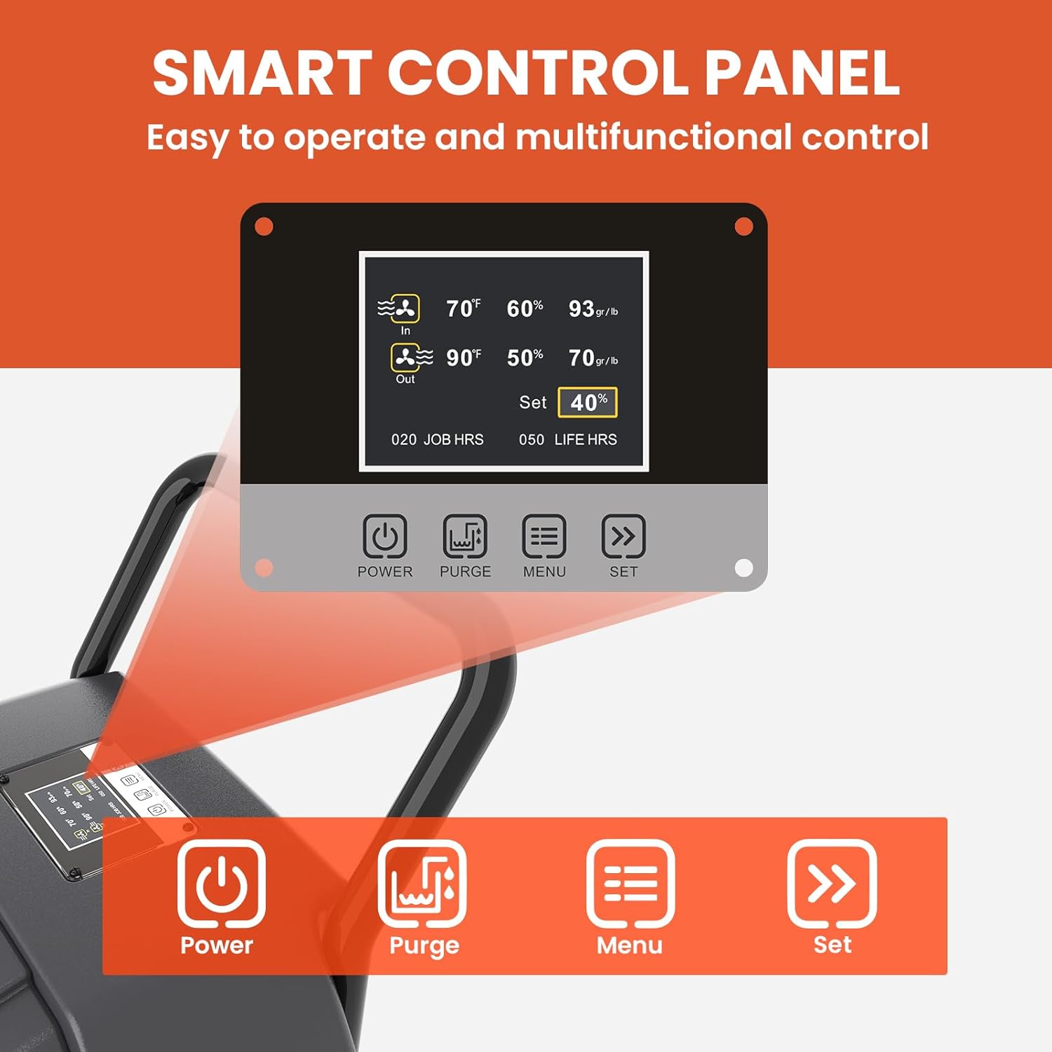 Smart control panel on the Hurricane 850 Commercial Dehumidifier offers easy-to-use, multifunctional control, allowing users to adjust settings with precision. It includes a purge function, a smart humidistat, and an auto-restart feature in case of power outages, ensuring seamless operation.