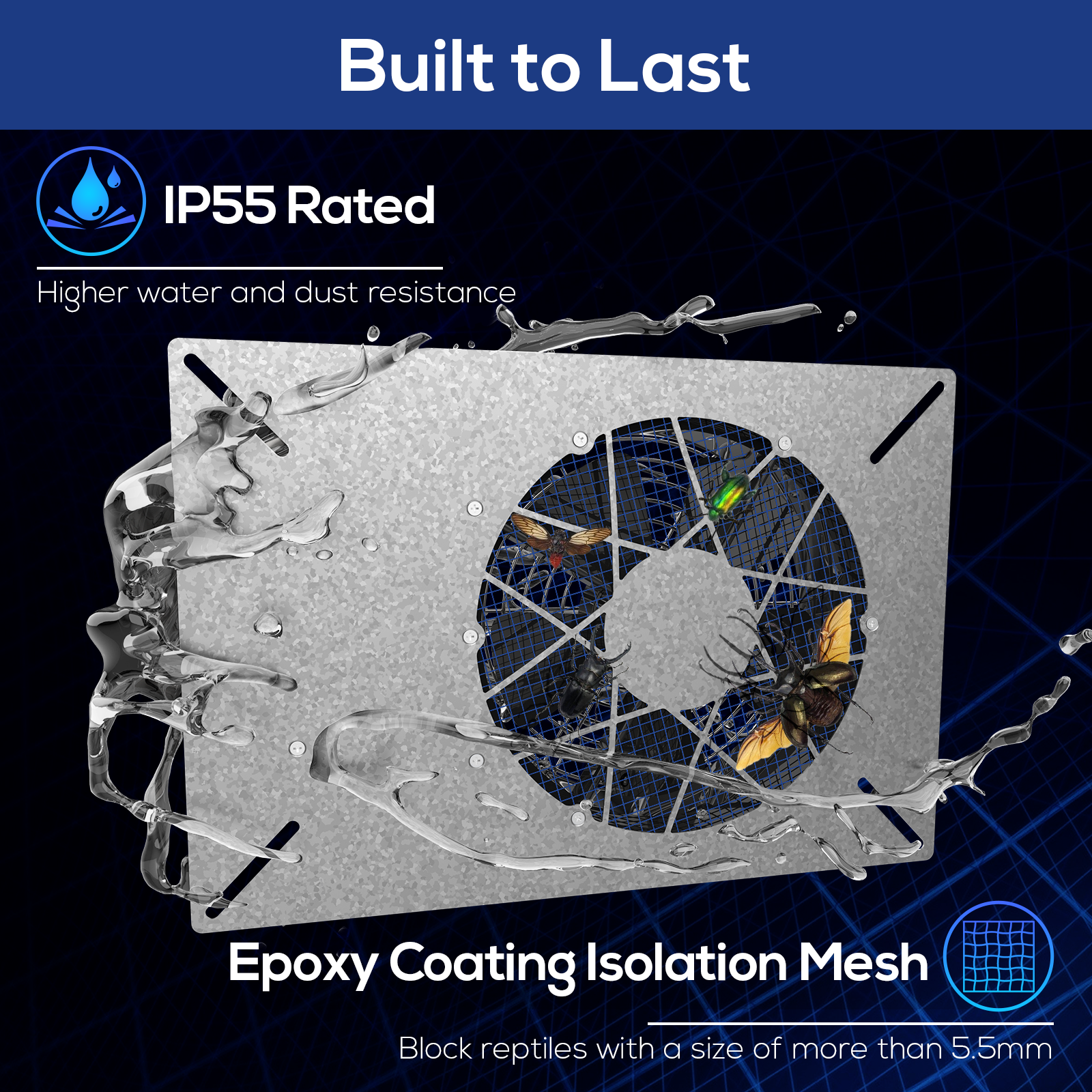 ◆Durable, Weather-Resistant Design: With a corrosion-resistant aluminum-zinc shell and IP-55 rating, the fan is highly resistant to moisture, dust, and other environmental factors, making it suitable for long-term use in harsh crawlspace or basement environments.